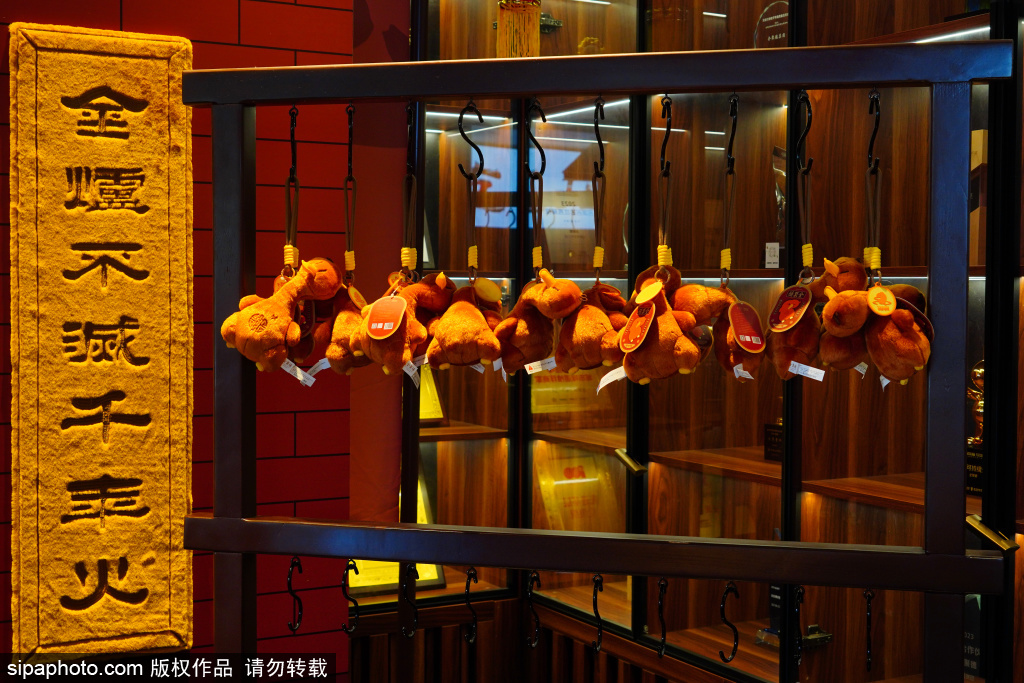 全聚德和平门店的“好鸭好呀坊”。毛绒绒质地的“全聚德”牌匾以及那古老的楹联:幌子摇曳的木质柜台上,微型片鸭车、枣木烤鸭炉等场景逼真还原,仿若穿越至161年前“全聚德”初创的年代。“好的鸭”毛绒玩具系列,将国家级非遗烤鸭技艺转化为可触可感的毛绒艺术。