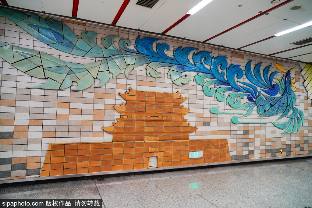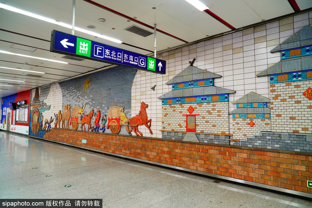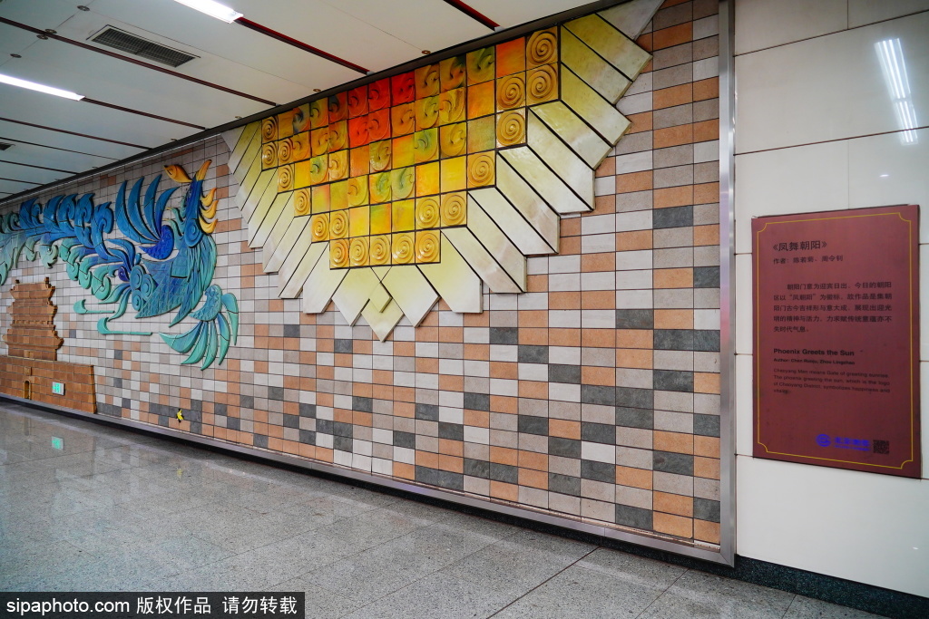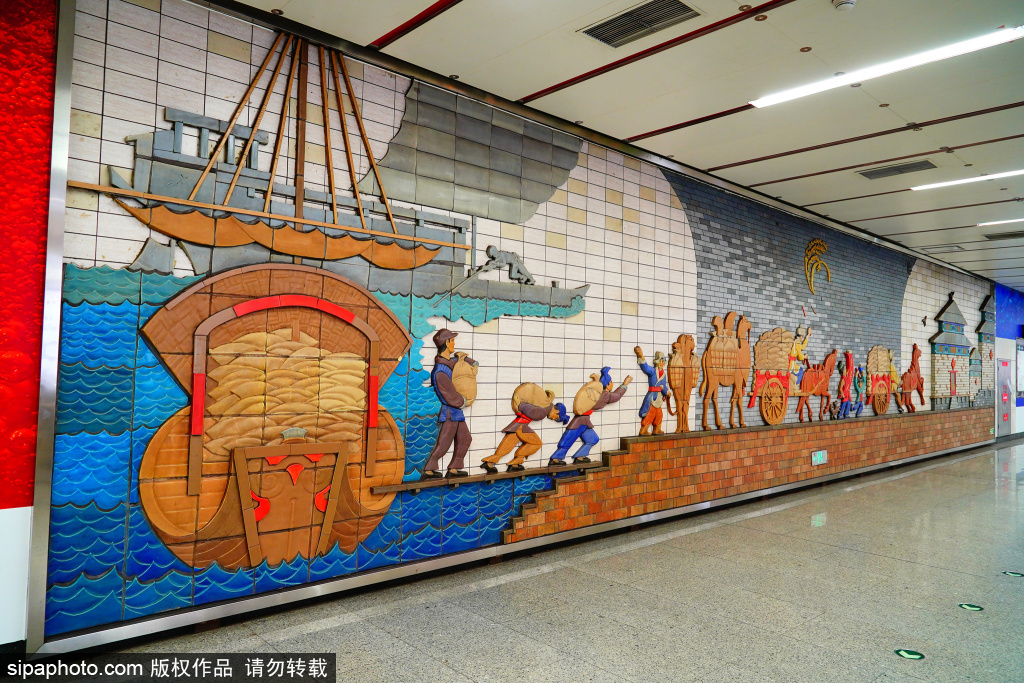 地铁6号线朝阳门站。站内《京东粮道》主题壁画,再现明清时期运粮繁荣景象。朝阳门是明清时的进京粮门,作品以浪漫主义手法表现前往粮仓途中驳运、车载、骆驮、人搬的运粮景象,力求生活化与戏剧性统一,写实性与装饰性统一。