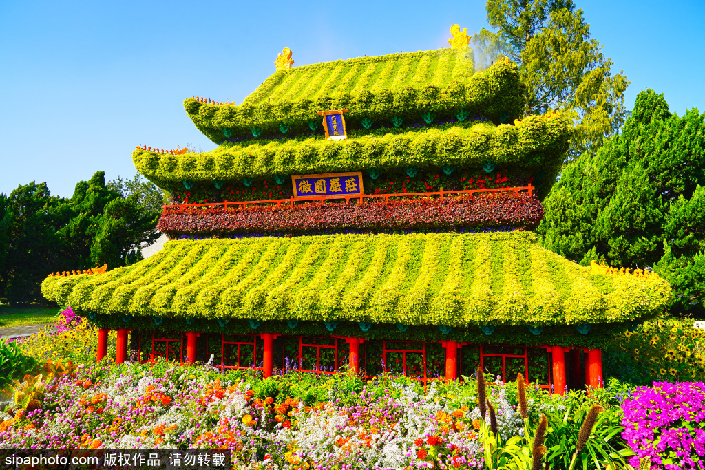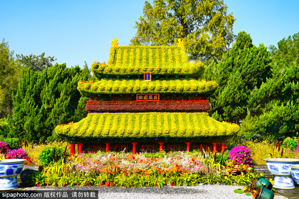 北海公园阐福寺,用植物打造的大佛殿微缩景观。大佛殿1919年被焚毁,其规制仿正定隆兴寺。楼高三层,而为“明二暗一”,顶层为重檐歇山顶,瓦顶皆为黄琉璃瓦绿剪边。顶层悬乾隆皇帝所书额名“大雄宝殿”,中层额为“极乐世界”,下层额为“福田花雨”。