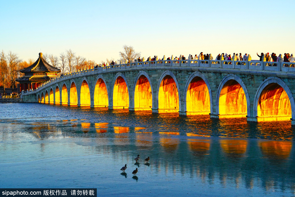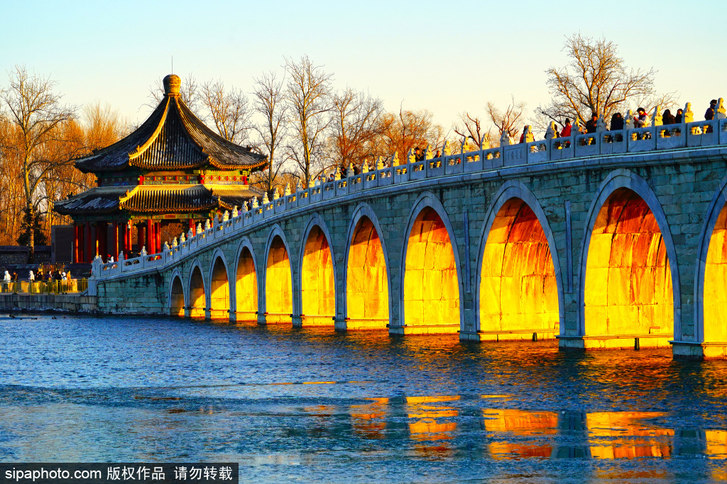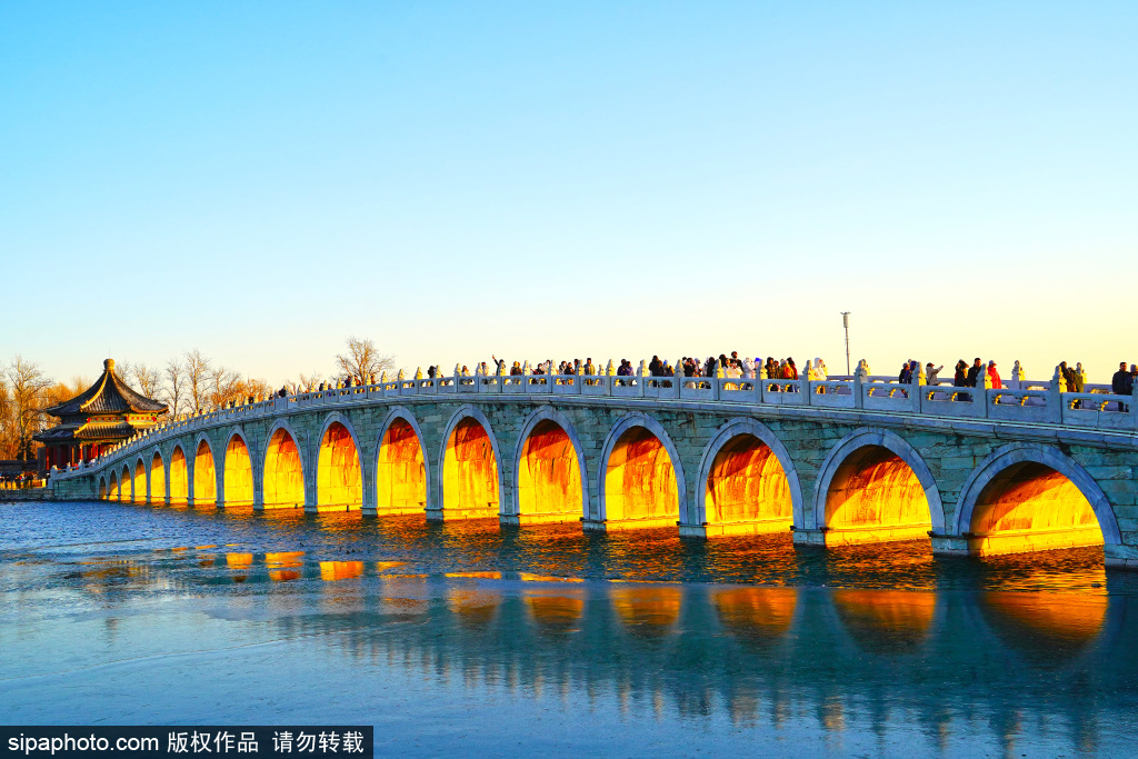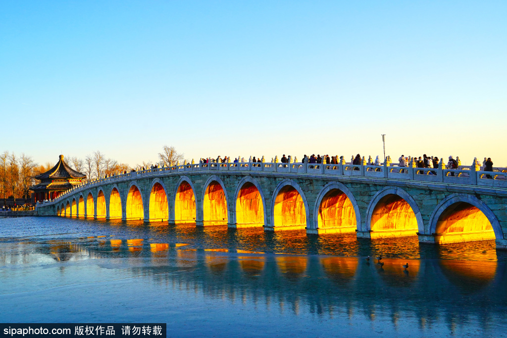 12月8日,日落时分,颐和园十七孔桥再现“金光穿洞”景观。金色的阳光照亮了十七孔桥桥洞,众多游客纷纷举起相机和手机,记录这一美好时刻。