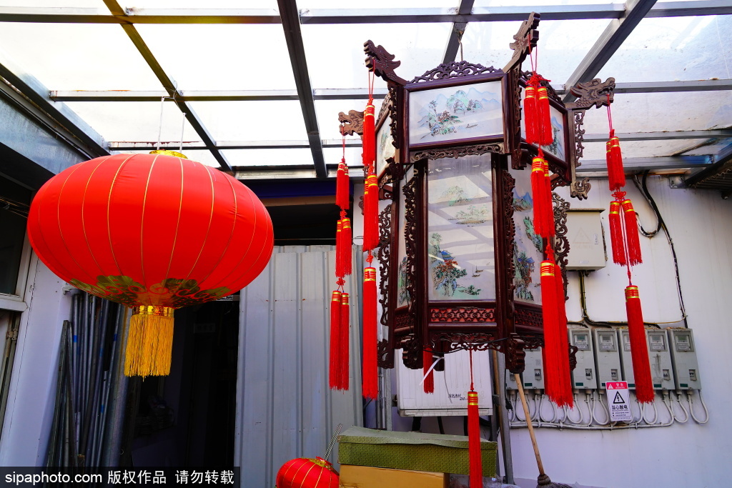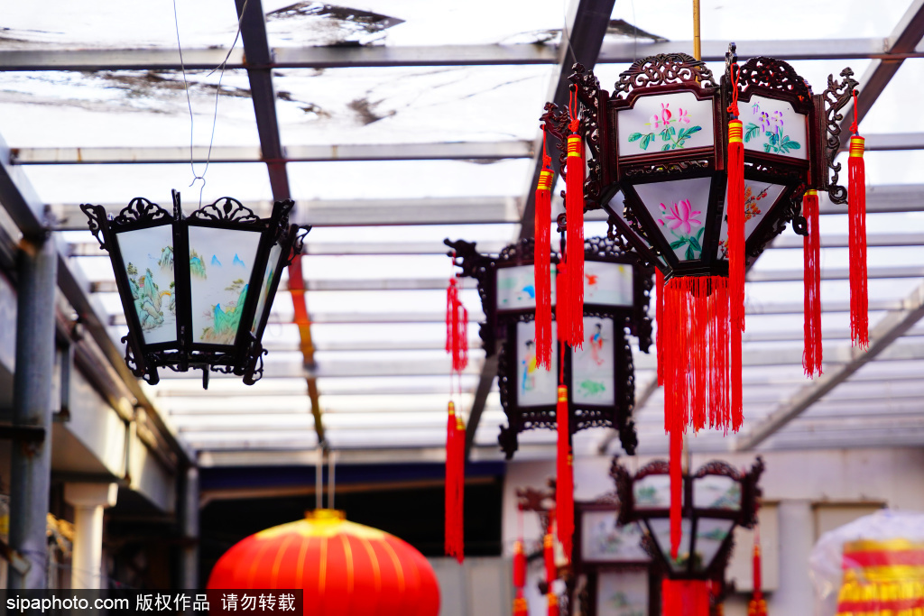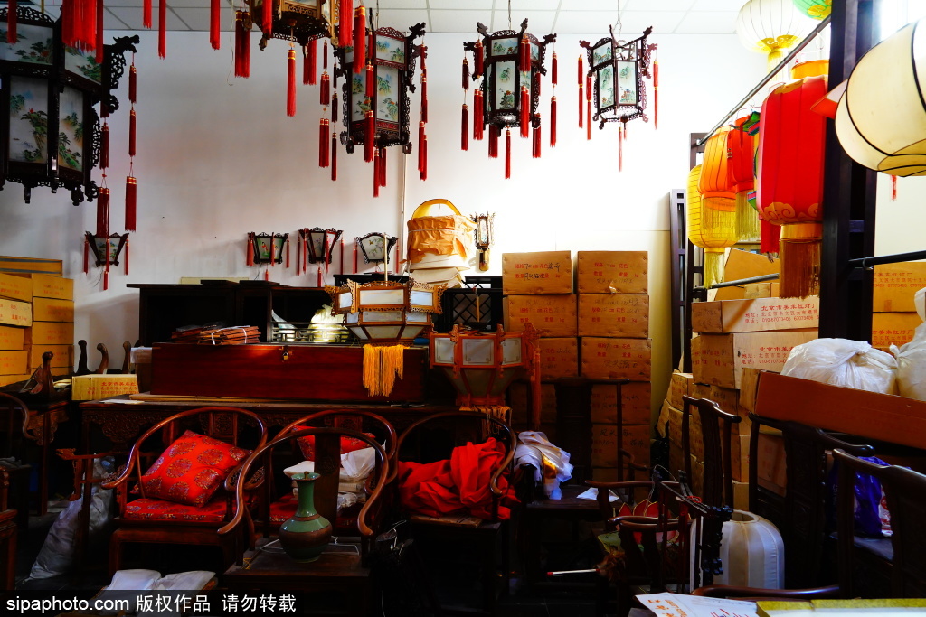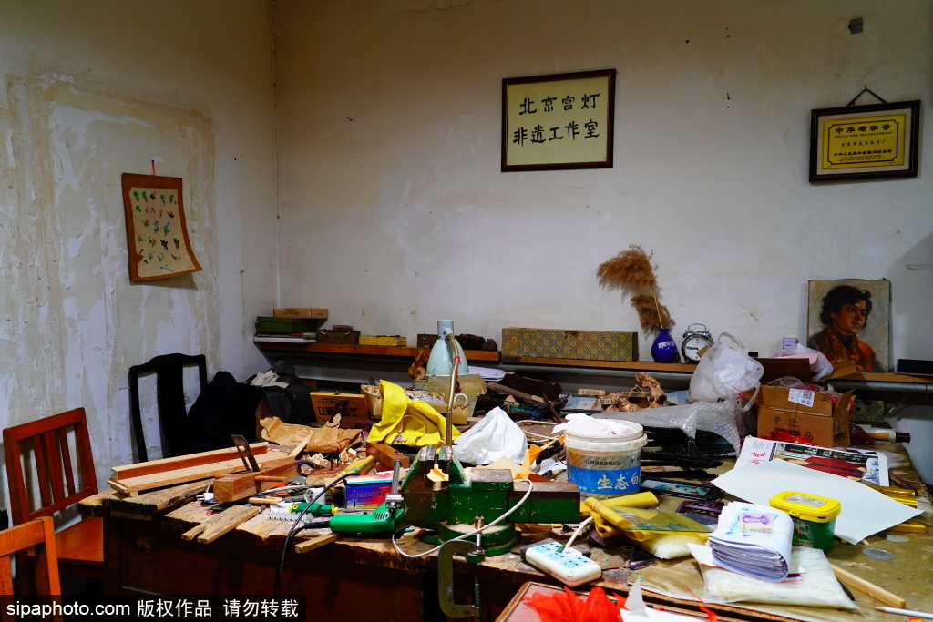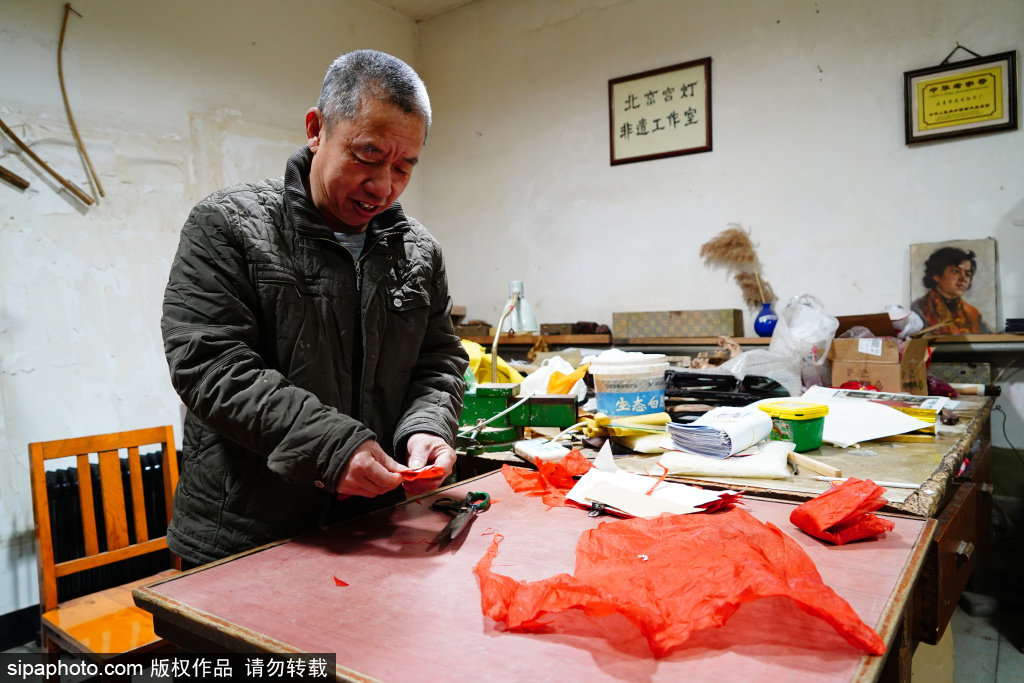 近日,北京市美术红灯厂,职工郭燕青在工作。库房的屋顶上悬挂着六方双层灯、五方灯、半壁灯等各式宫灯样品,大的直径近两米,小的也有一米多。每一盏宫灯,都由木构框架、玻璃灯画和丝织穗子组成,看上去是那么精致、漂亮。北京市美术红灯厂的前身,是始创于1806年的老字号文盛斋。
