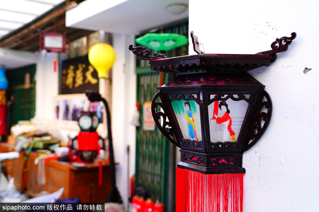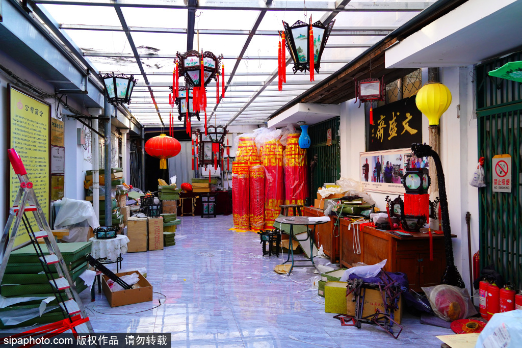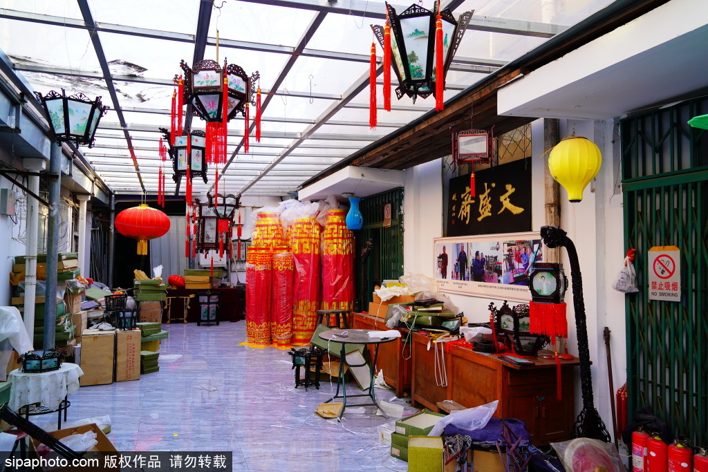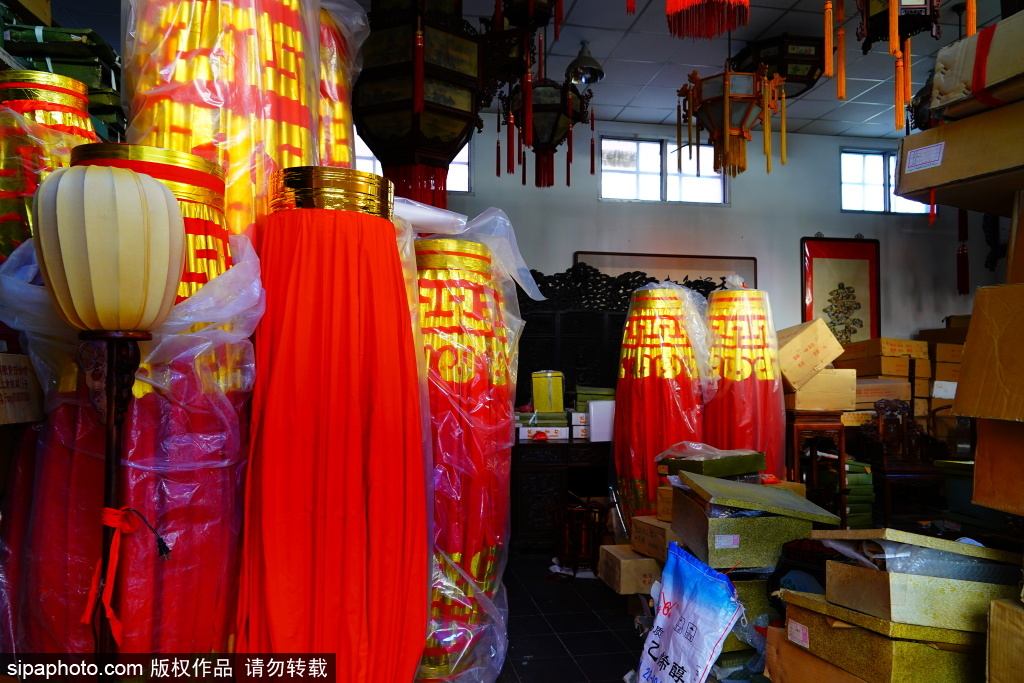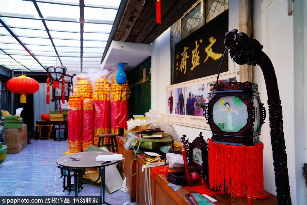 近日,北京市美术红灯厂,职工郭燕青在工作。库房的屋顶上悬挂着六方双层灯、五方灯、半壁灯等各式宫灯样品,大的直径近两米,小的也有一米多。每一盏宫灯,都由木构框架、玻璃灯画和丝织穗子组成,看上去是那么精致、漂亮。北京市美术红灯厂的前身,是始创于1806年的老字号文盛斋。