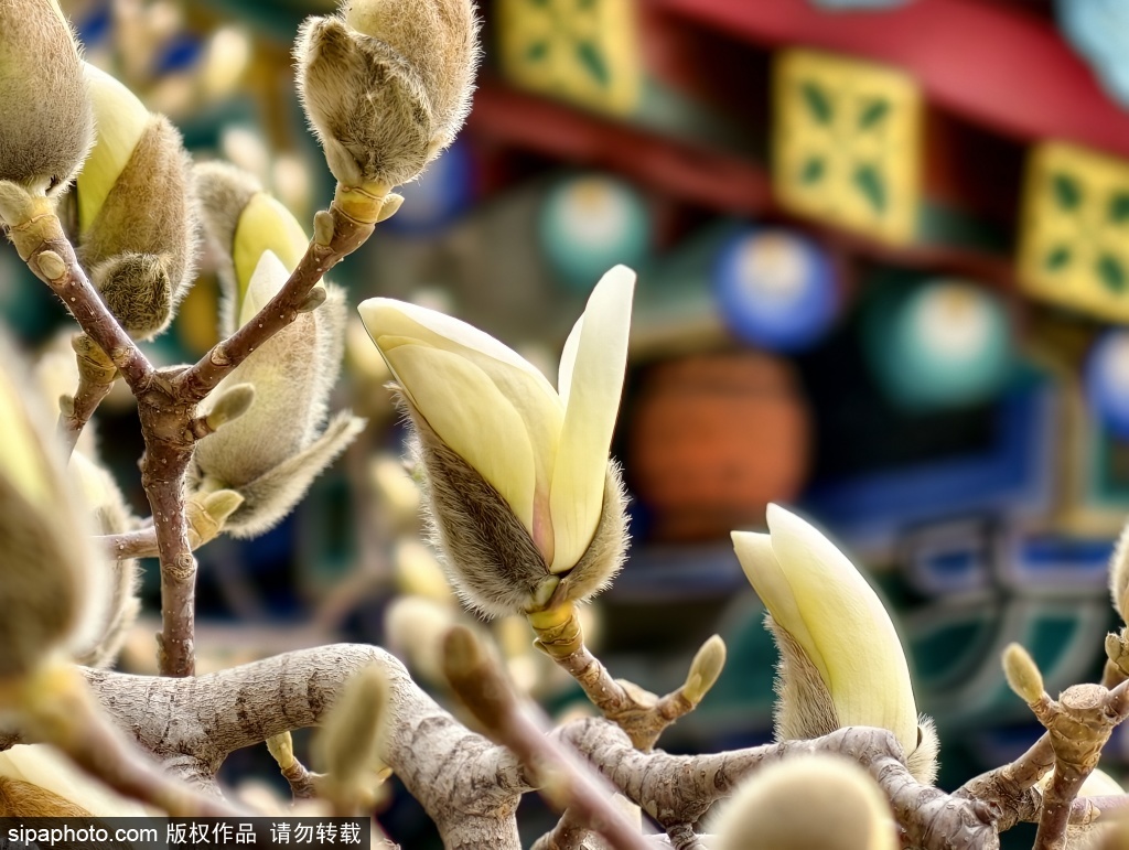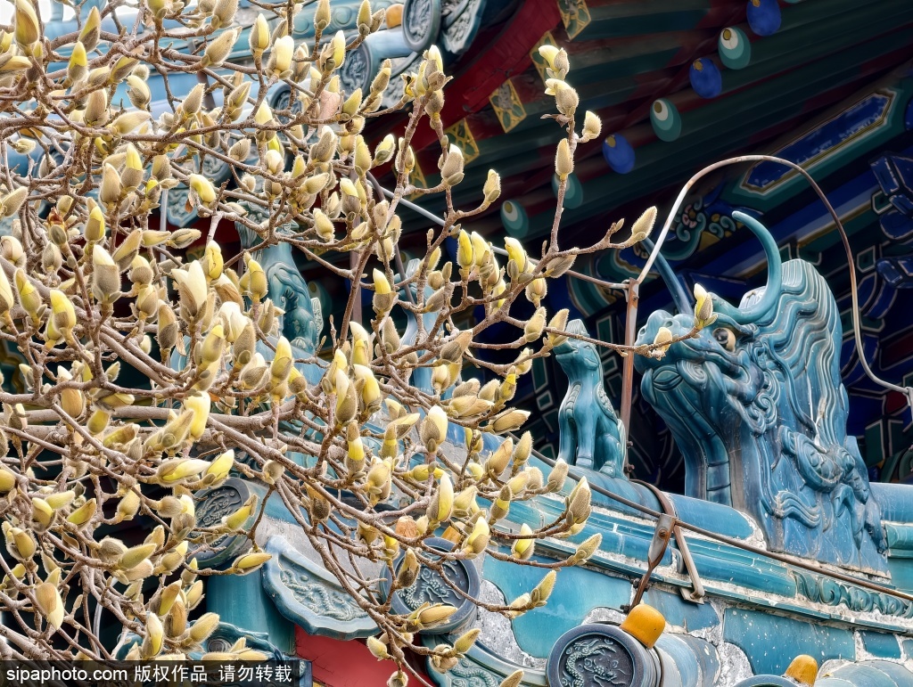 3月14日,中山公园,兰亭八柱亭旁数株玉兰已挂满毛茸茸的花苞,在春日暖阳中静待绽放,与蓝色琉璃瓦古建筑构成一幅静谧典雅的早春画卷。