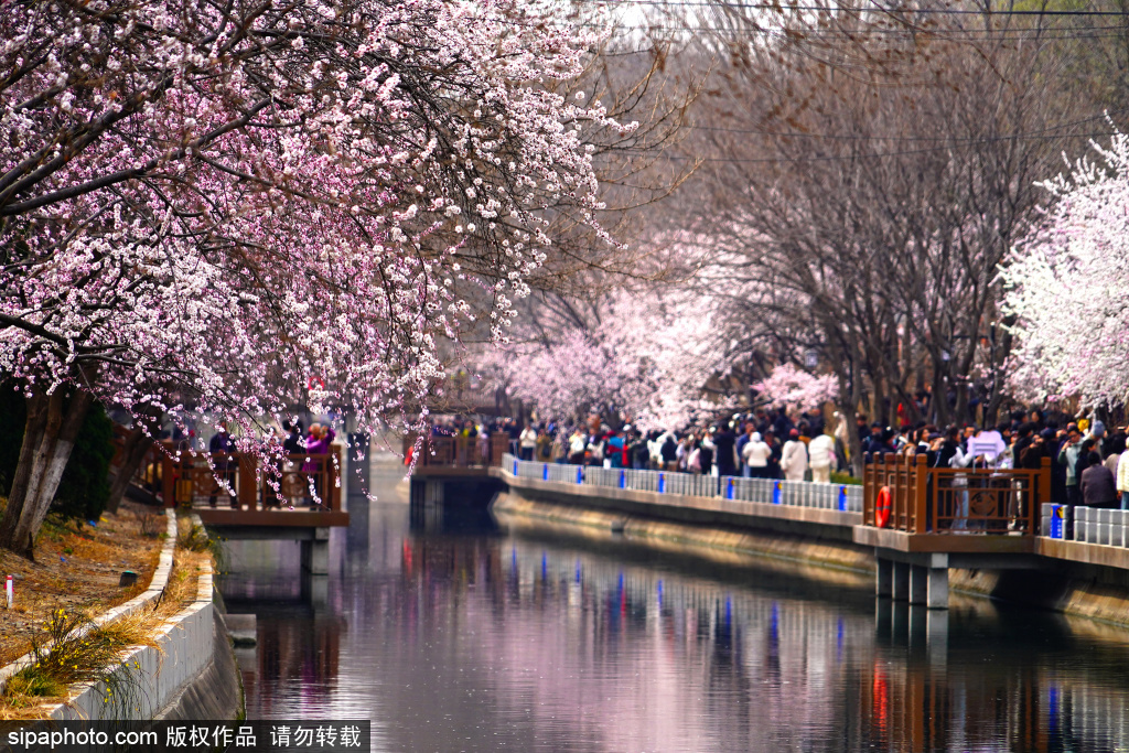 3月14日,十里堡二道沟河畔的山桃花盛开,迎来众多市民观赏。绵延百米的“粉色花廊”倒映水中,一年一度的“水映桃花”美景如约而至。