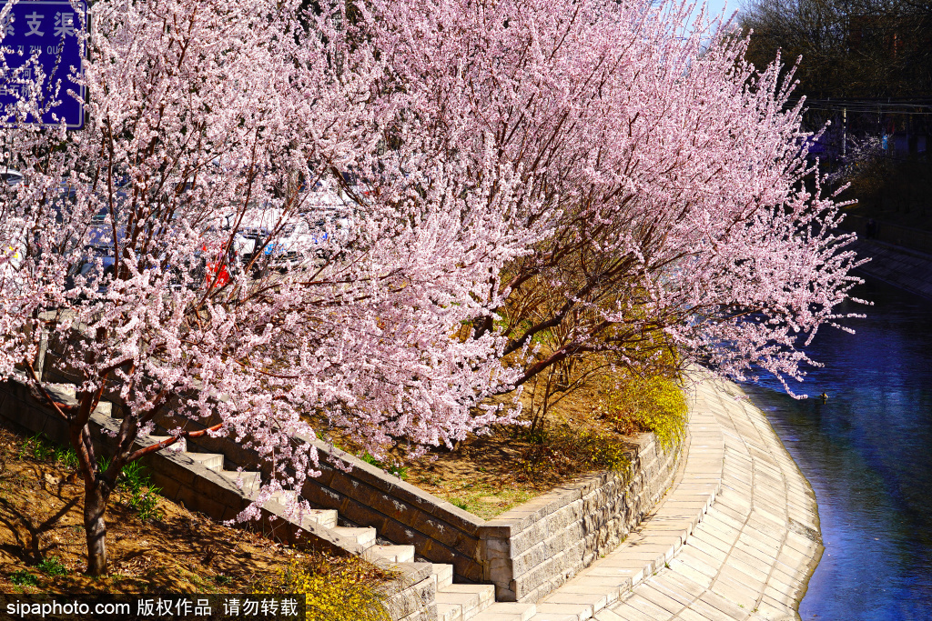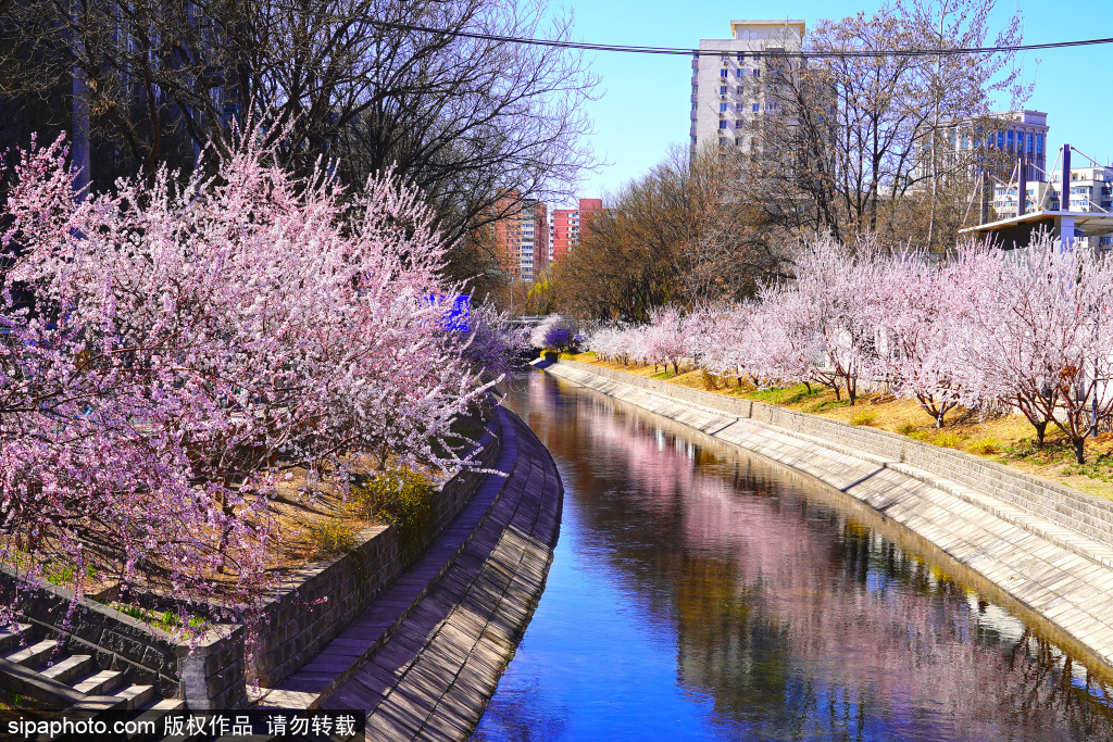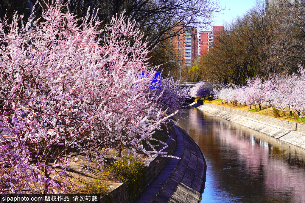 3月18日,紫竹桥南的双紫支渠沿岸山桃花盛放。两岸花树缀满粉白相间的花朵,与碧水相互映衬,景色宜人。