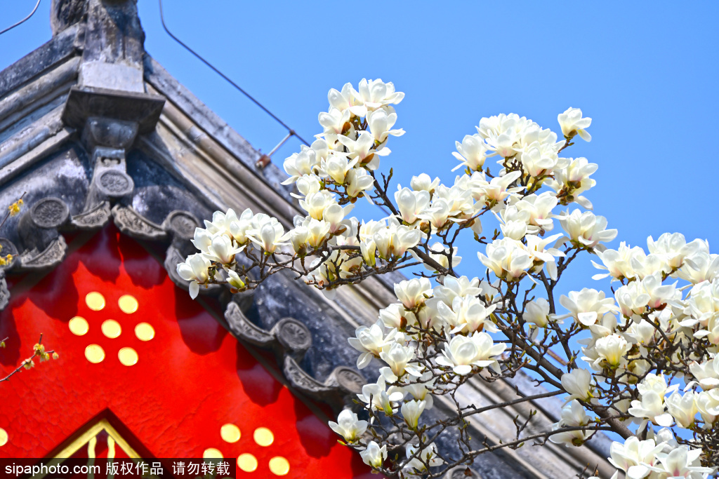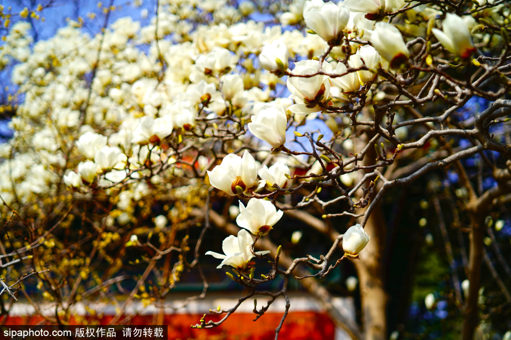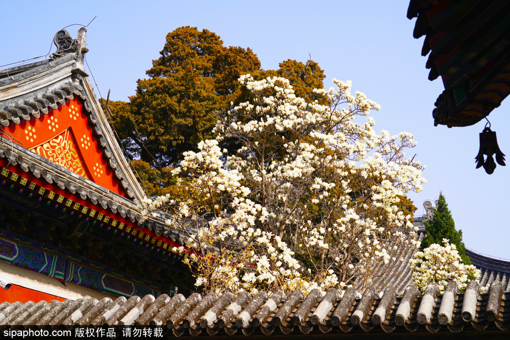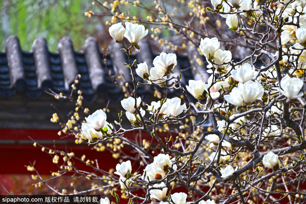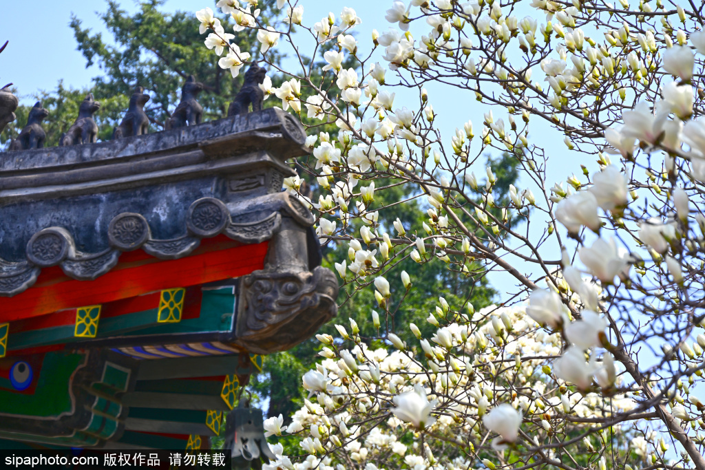 3月25日,多处古刹春日花事渐入佳境。万寿寺内大片玉兰花正在绽放,芬芳淡雅的玉兰与古建筑相得益彰,美景如画。