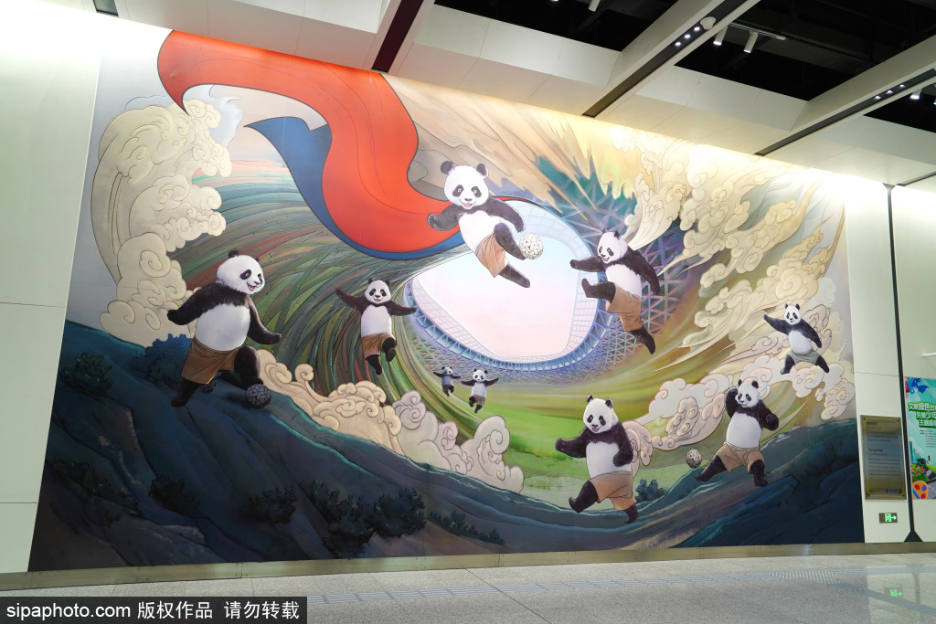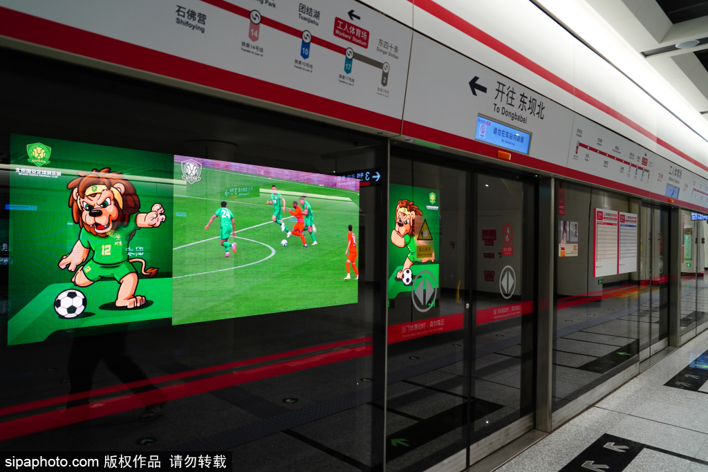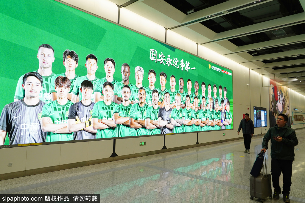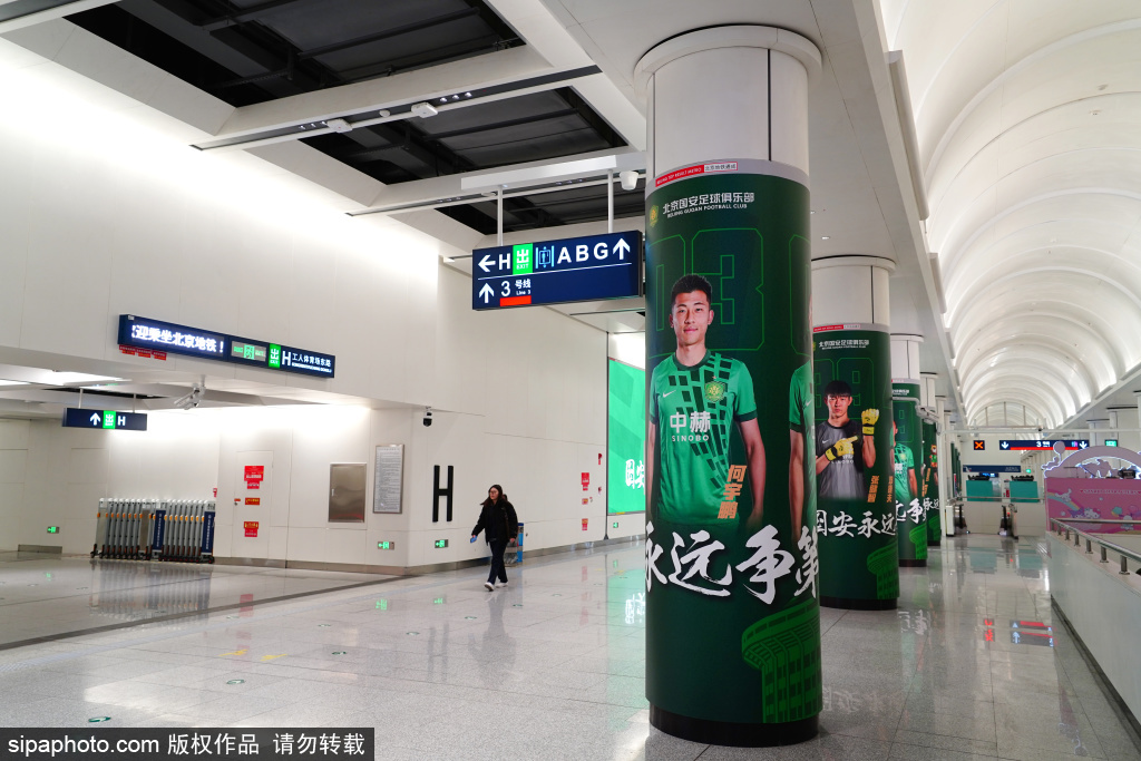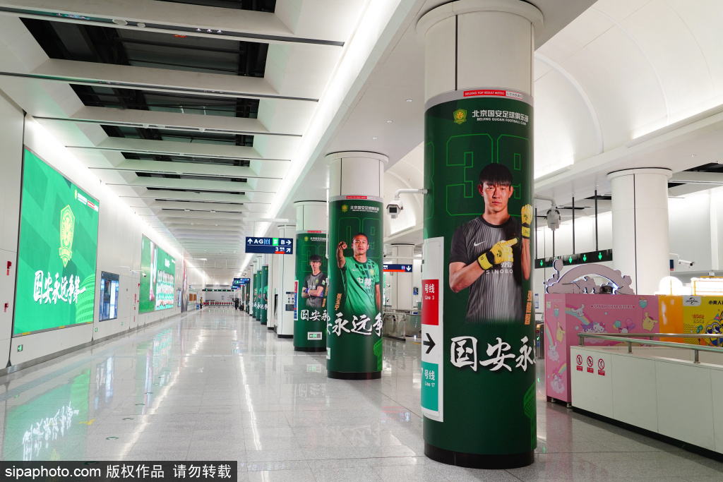 3月23日,地铁3号线工人体育场站,随处可见北京国安队的文化元素。近日,北京地铁公司联合北京国安足球俱乐部,在地铁3号线工人体育场站推出北京全市首个足球主题站。站内循环播放国安新赛季赛事集锦与高光瞬间,11根站厅包柱量身定制国安球员海报,让每位乘客都能感受到绿茵激情。