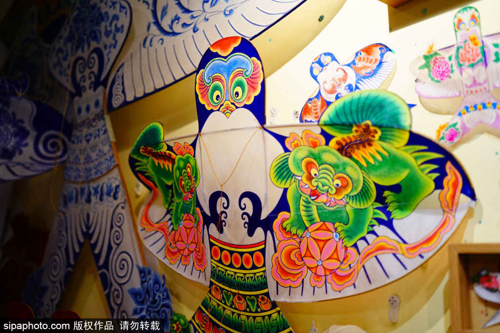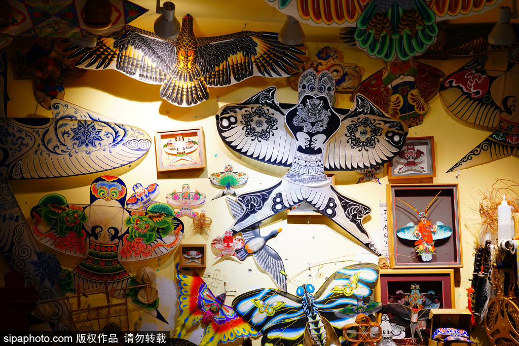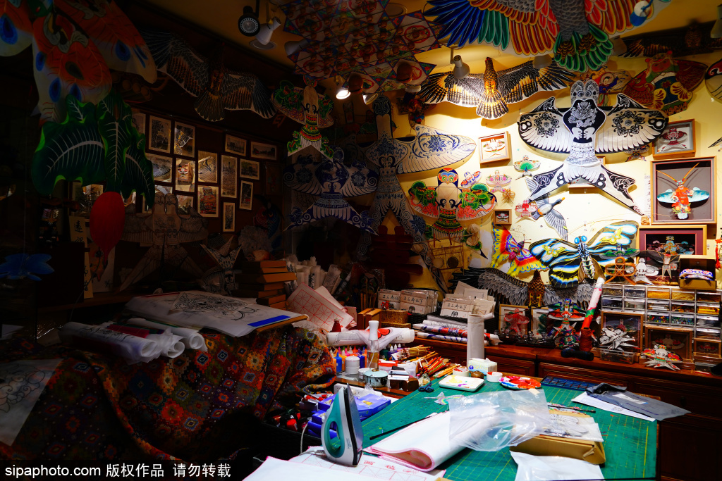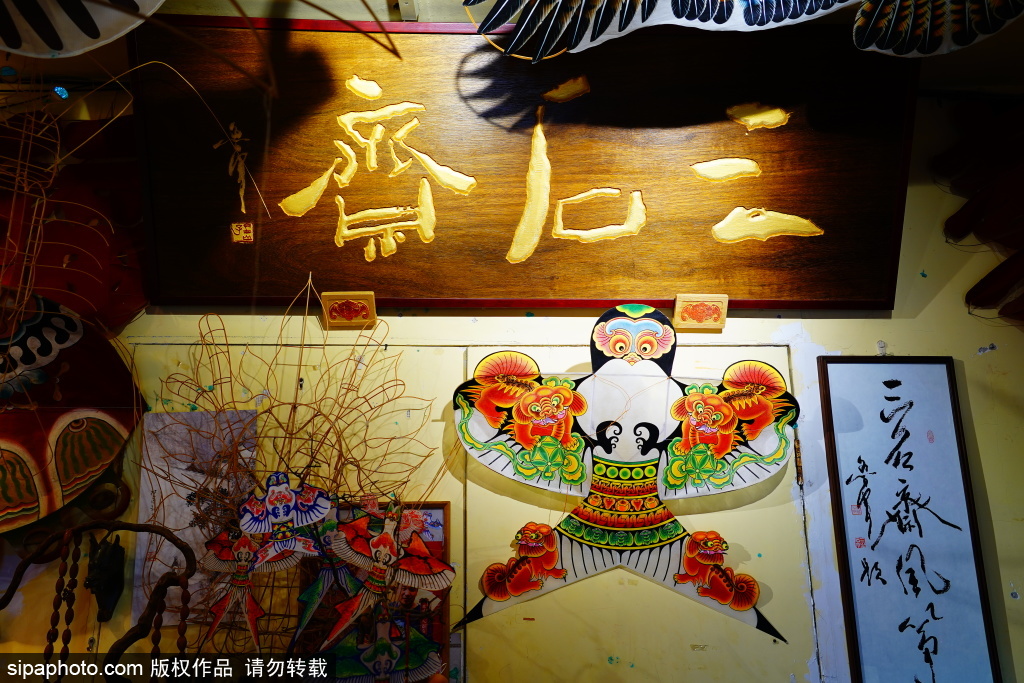 地安门西大街甲25号,三石斋风筝店。门口有几块牌匾,格外引人注意——国家级非物质文化遗产、北京西城区级非物质文化遗产、家庭艺术馆。推开门更是别有一番天地,店不是很大,却有着上百只做工精良,生动美观的宫廷风筝。