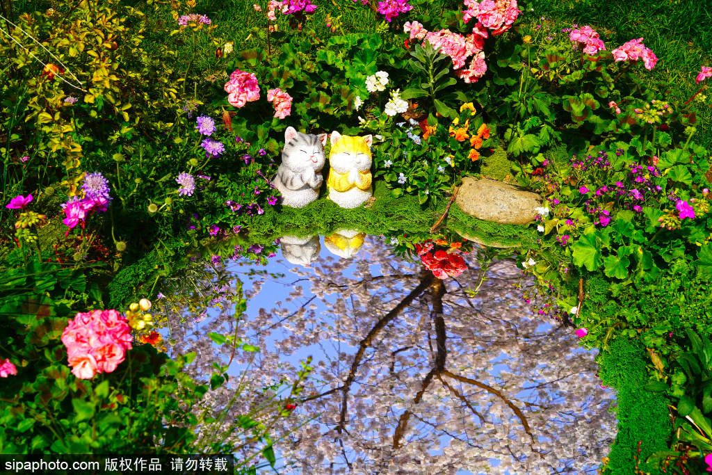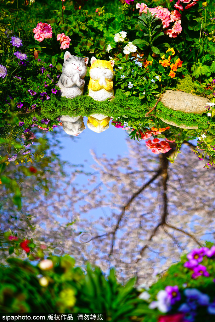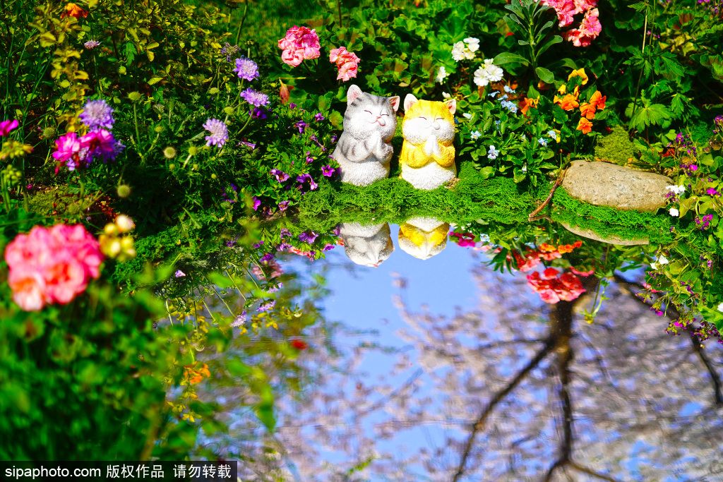 3月29日,玉渊潭公园春意正浓,今年樱花节的“新晋顶流”——守在“池塘”边的小猫咪和荡秋千的小兔子萌态十足。憨态可掬的两只小猫摆件静卧花丛,一旁的镜面装置将蓝天、樱花一同收纳,虚实之间仿佛闯入童话世界。