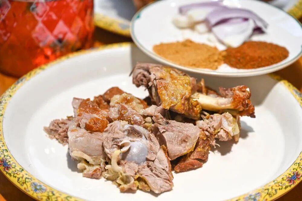 门头沟待客的诚意之选,每日空运新疆巴音布鲁克黑头羊经地坑古法木柴慢煨,外皮焦香酥脆,肉质鲜嫩多汁。