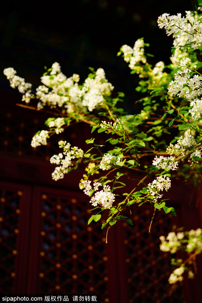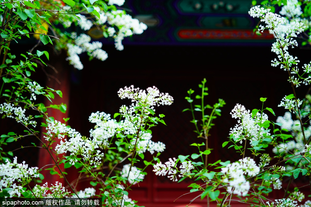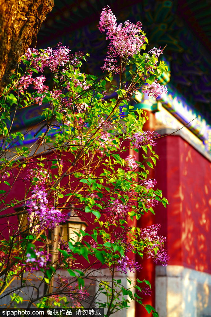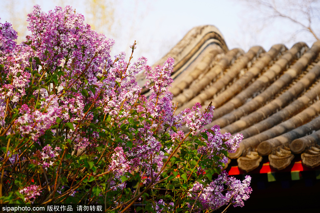 3月31日,北京,法源寺内的丁香花陆续绽放,如云似雪,幽香漫溢。丁香花在夕阳的照耀下,与古寺建筑同框,美景如画。