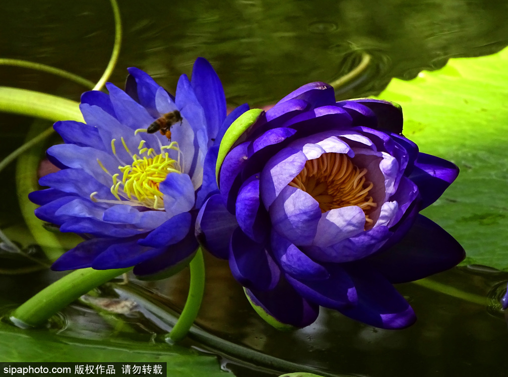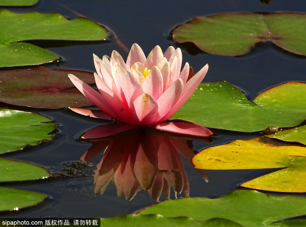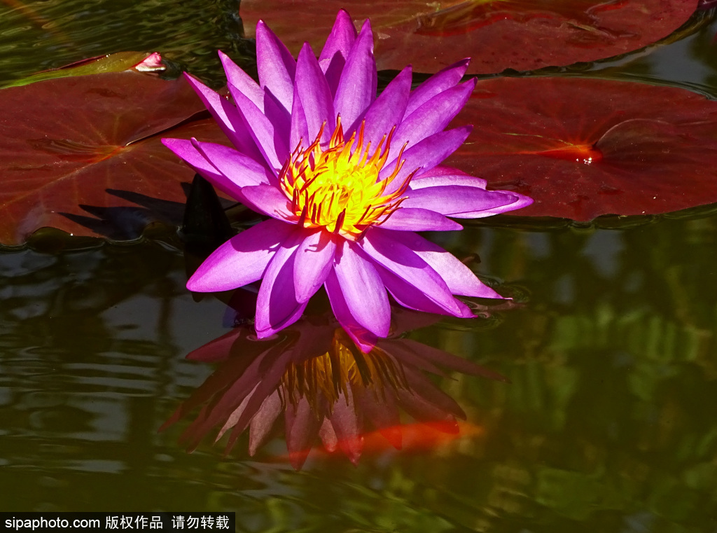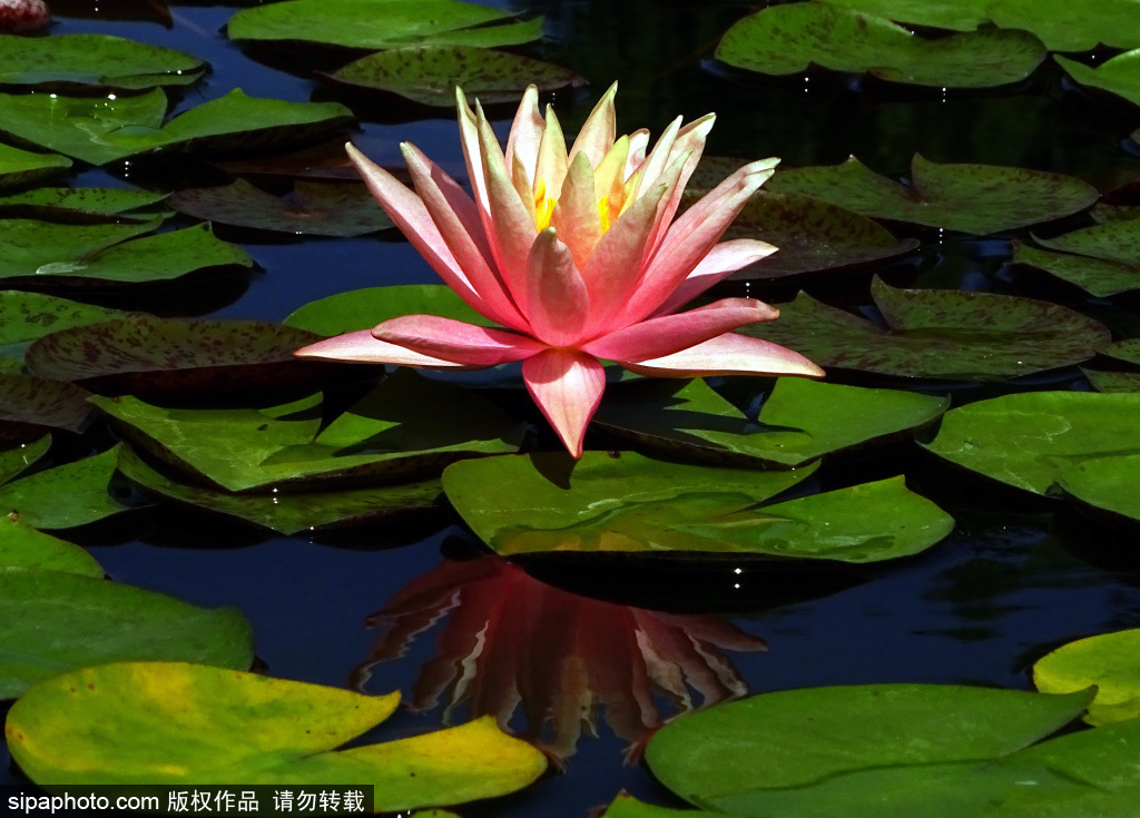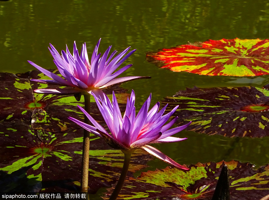 9月18日,莲花池公园睡莲依然娇艳绽放,绚丽多彩,妩媚迷人,与水中倒影相映成趣,美仑美奂,宛若进入莫柰花园。