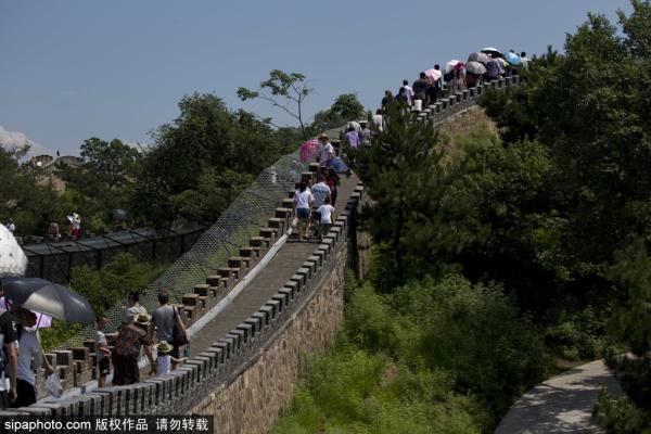 河北承德避暑山庄风景区,众多游客乘车登上山顶,在宫墙上观赏景区风光。承德避暑山庄是国家AAAAA级旅游景...