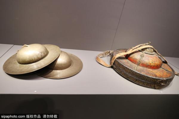 近日,在故宫博物院举行的“万法归一:萨迦寺历史文化与艺术”展上拍摄的明永乐时期的铙钹和18世纪的铙钹匣。