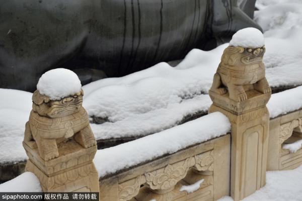 2023年12月11日,北京,京城普降2023年冬天第一场瑞雪,颐和园小狮子等“萌宠”憨态可掬惹人爱。