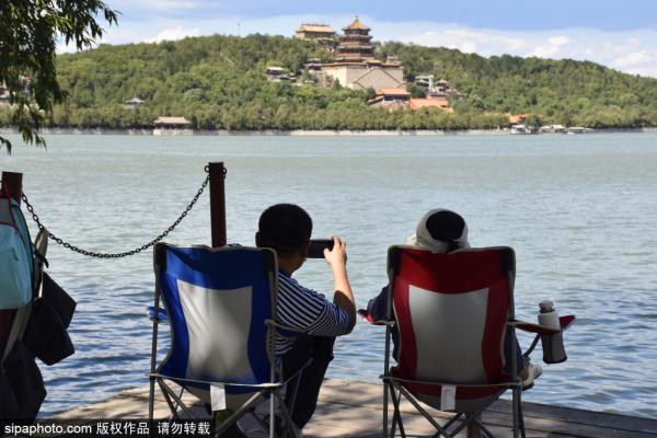 2023年7月8日,北京,京城持续高温热浪滚滚,游客“全副武装”在颐和园游玩。