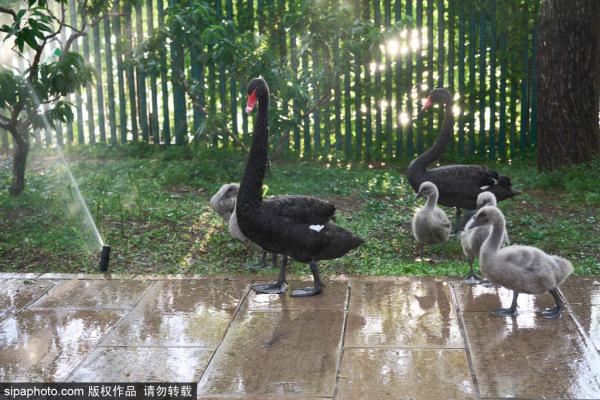 2023年6月5日,北京颐和园昆明湖西湖的黑天鹅上岸“淋浴”享受夏日清凉。根据气象北京微信公众号消息,预计未...