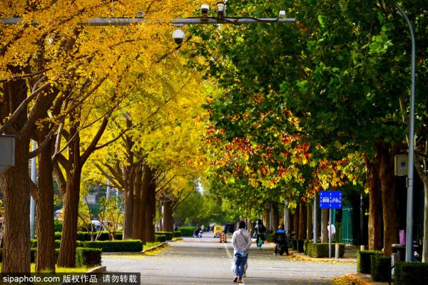 2023年11月6日,北京,东直门外大街银杏树叶金光灿灿,与旁边一排梧桐树叶构成了一幅一半金黄一半绿的“平分...