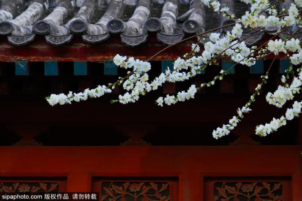 2023年3月26日,北京,雍和宫北院墙外桃树盛开,桃花挂满枝头,皎洁清丽、馥郁芬芳,白色桃花争相绽放,纯...