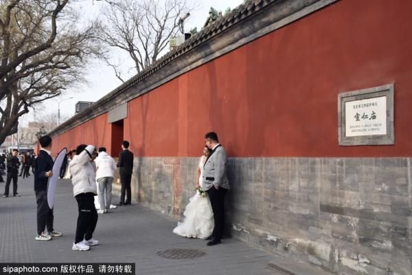 2023年3月19日,北京,北池子大街网红墙成婚纱照热门打卡地。