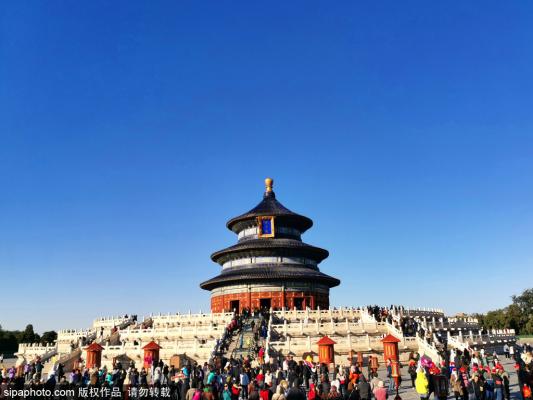 2023年11月9日,初冬时节,北京持续晴冷“高颜值”天气,蓝天下天坛的祈年殿与前门地区的正阳门城楼等地标更...
