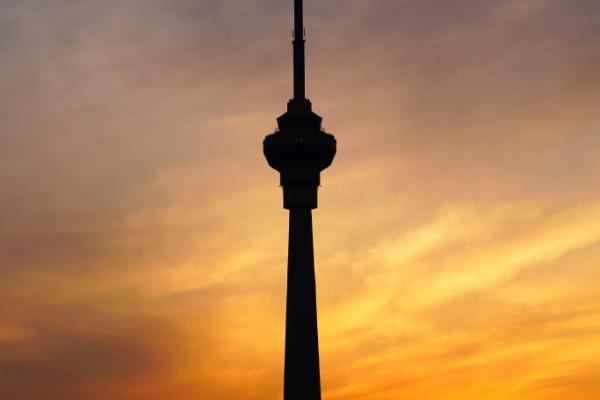 2023年5月7日,北京,玉渊潭公园,傍晚时分现绚丽晚霞。城市上空夕阳和橘色晚霞映照城市楼阁,景色迷人,令...