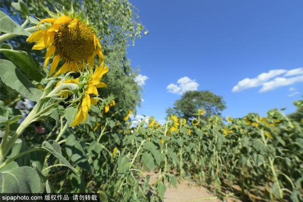 2023年7月8日,北京奥林匹克森林公园,向日葵花海盛开,游客在向日葵花海里拍照打卡。