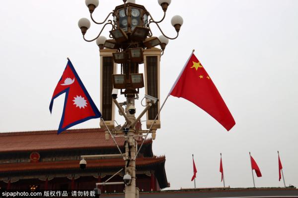 2023年9月26日,北京天安门前悬挂的尼泊尔国旗和中国国旗。应国务院总理李强邀请,尼泊尔总理普拉昌达于9月...