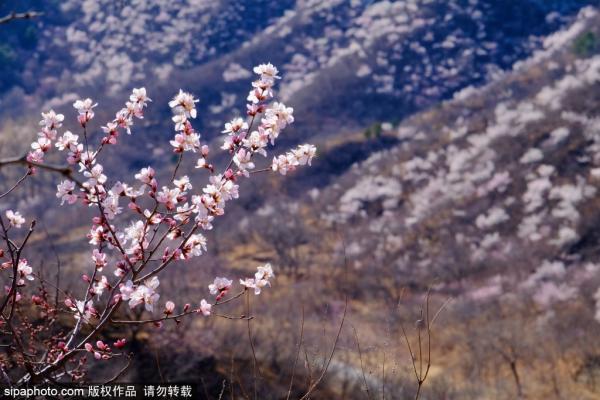 2023年3月18日,北京昌平郊区,山桃花遍布山野,环抱着村庄,行车在怀长路和昌赤路上便可欣赏这如画精致。