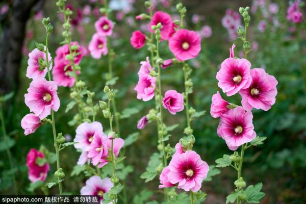2023年6月8日,北京圆明园,距长春宫门不远的映清斋,小径两旁蜀葵花开正艳,游客漫步其中感受姹紫嫣红的夏...