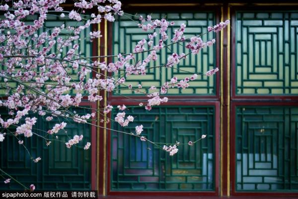 2023年3月27日,北京颐和园谐趣园景区内,花红柳绿,倒影浮楼,春色满园。图片为谐趣园内梅花。