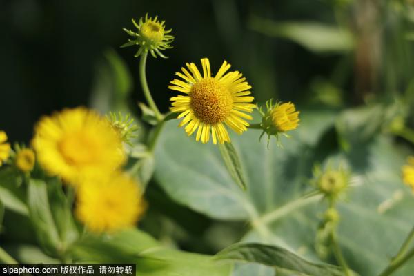 2023年7月22日,北京海淀玉渊潭公园内,湖水边生长的旋覆花开出的小黄花。旋覆花又名金佛花、金佛草、金钱...