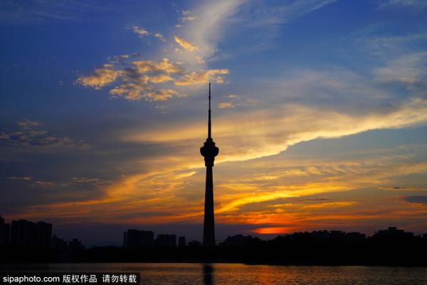 2023年7月23日,北京,连续两日大雨过后,周末傍晚迎来绚丽晚霞。落日余晖洒在玉渊潭公园湖面上,与中央电...