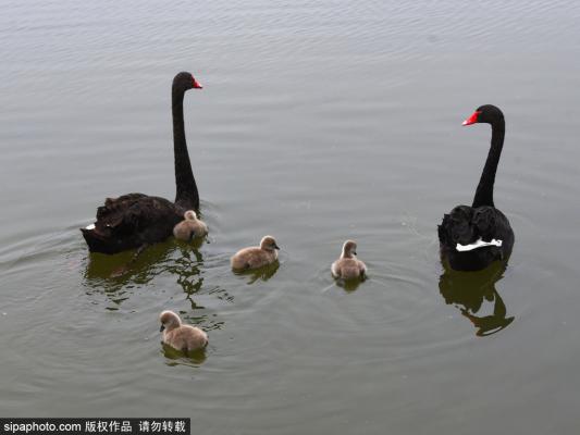 2023年5月12日,母亲节临近,北京,近日,在圆明园后湖景区,黑天鹅妈妈、爸爸携新生宝宝游玩觅食,其乐融...