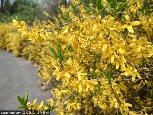2023年4月1日,北京,清明将至,北京奥森公园迎来客流高峰期,到此踏青的游客络绎不绝,连翘花盛开一片金灿...