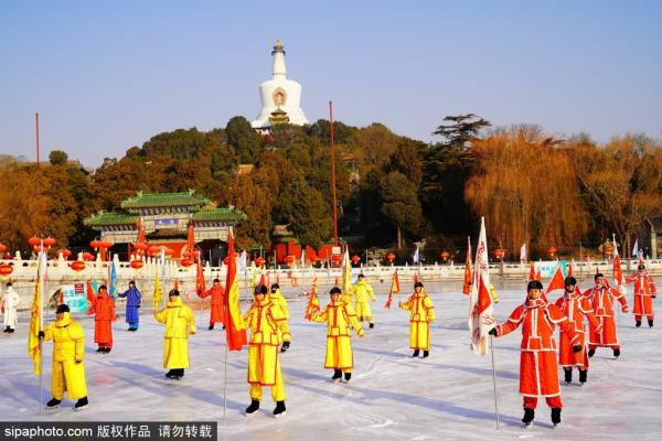 2023年12月29日,北京,专业的滑冰表演者身穿八旗士兵服装,在北海公园荷花湖冰场上演绎清代“皇家冰嬉”表演...