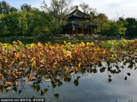 2023年10月19日,北京,圆明园湖水中的残荷造型各异, 呈现秋日别样美韵。