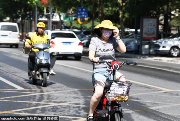 2023年6月24日,市民在河北省石家庄新乐市街头高温下全副武装骑车前行。