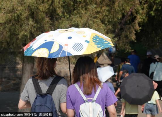 2023年6月24日讯,端午假期,北京晴热暴晒、高温红色预警持续,游客打伞包裹严实在颐和园游览,游兴不减。
