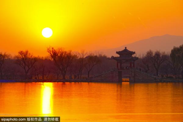 2023年12月3日,北京,周末天空晴朗,冬日颐和园昆明湖已结上冰,夕阳西下,日落余晖洒在冰面上,形成倒影...