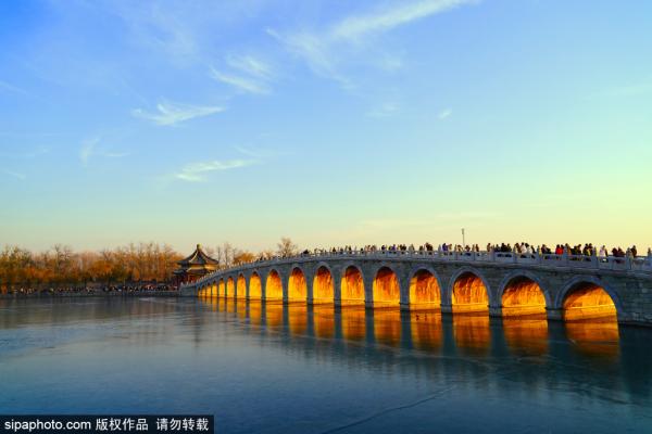 2023年12月3日,北京,颐和园昆明湖湖面已经结了一层冰,落日余晖穿过十七孔桥的孔洞,金光恰好照射在所有...