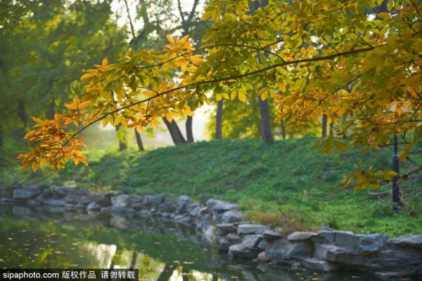 2023年10月24日,霜降节气圆明园秋色怡人,树木黄绿相接,荷塘尚留残叶,落叶纷纷而下,市民游客仿佛置身中...