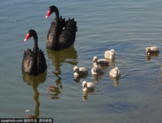 2023年12月3日,北京圆明园景区湖水中,近期新出生的七只黑天鹅宝宝跟随父母戏水、觅食,呆萌可鞠,吸引游...