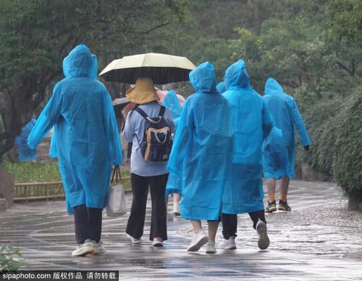 2023年5月25日下午,北京突降雷阵雨,圆明园游客雨中游玩热情不减。