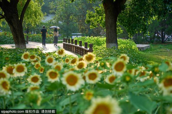 2023年6月28日,北京奥林匹克森林公园北园区内种植的百亩向日葵相继开放,游客倘佯在向日葵花海中享受浓厚...