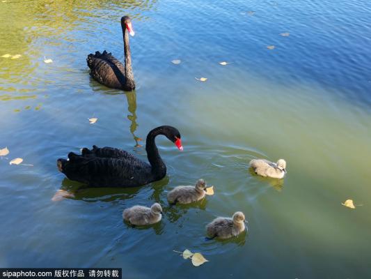 2023年10月26日,深秋时节,北京圆明园景区,四只近期新出生的黑天鹅幼崽随父母外出游玩、觅食,毛茸球似的...