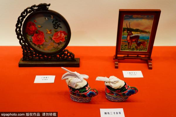 2023年12月7日,北京,中国工艺美术馆,“绣在青海——‘青绣’艺术保护传承创新发展”成果展展出的刺绣类非遗作...