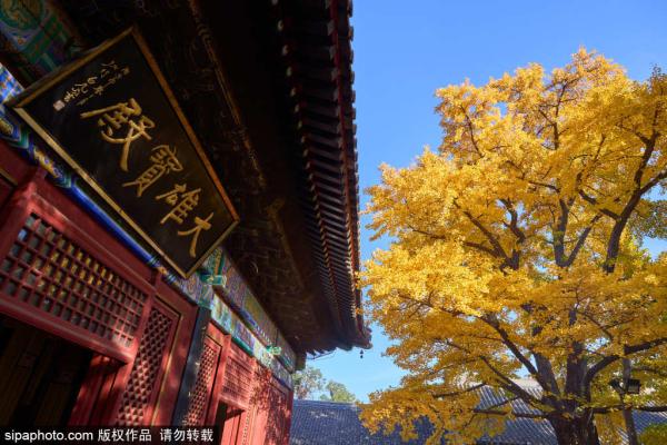 2023年11月3日,北京红螺寺内两颗千年银杏树在阳光的照射下闪耀金光。红螺寺大雄宝殿前的这两颗银杏树一雄...