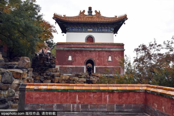 2023年11月5日,北京,金秋时节,颐和园四大部洲景区风光静好,朱红瓦绿黄叶醉人美到穿越。