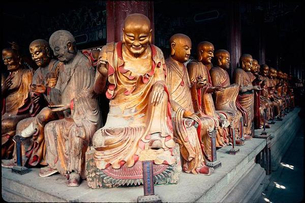 碧云寺罗汉堂,建于清乾隆十三年(1748年),平面呈“田”字形布局,东面前轩(天王殿)与堂相连,殿堂的南、...